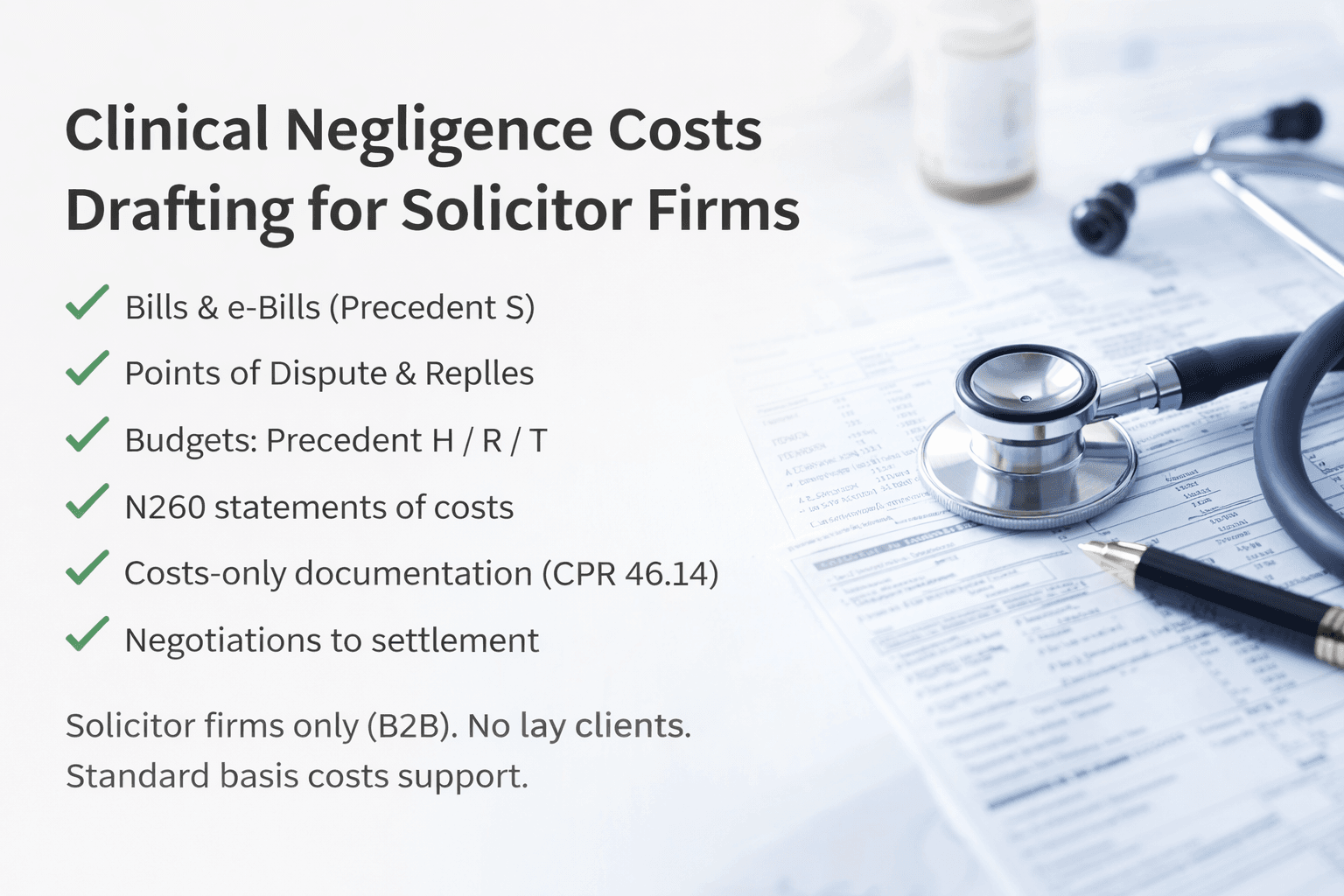 PD 47–compliant Bills/e-Bills and N260s that settle. Drafting, vouchers, PoDs/Replies, payments on account, and DCCs. First Bill free.